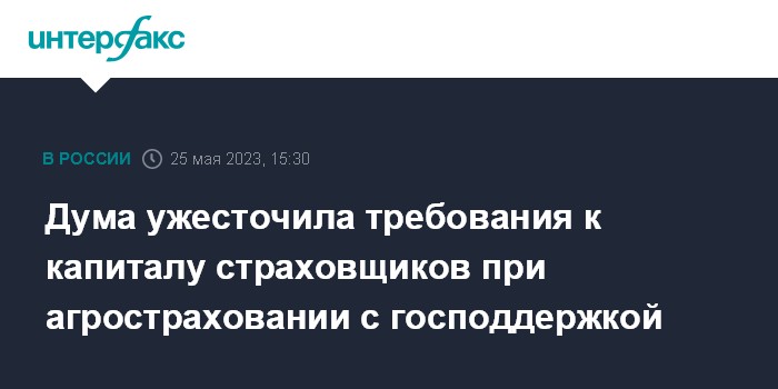 Москва. 25 мая. INTERFAX.RU - Госдума приняла во втором и третьем чтениях правительственный законопроект № 246138-8 об ужесточении требований к капиталу страховщиков при всех видах агрострахования с господдержкой до 3 млрд рублей.