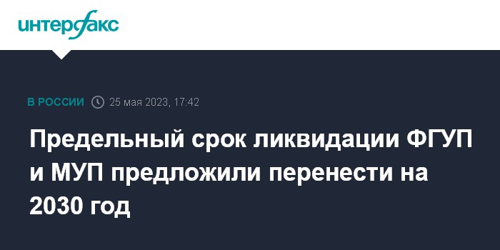 Москва. 25 мая. INTERFAX.RU - Предельный срок ликвидации федеральных государственных и муниципальных унитарных предприятий (ФГУП и МУП) предлагается перенести на 5 лет – с 1 января 2025 г. на 1 января 2030 г., говорится в законопроекте, внесенном в Госдуму сенаторами.