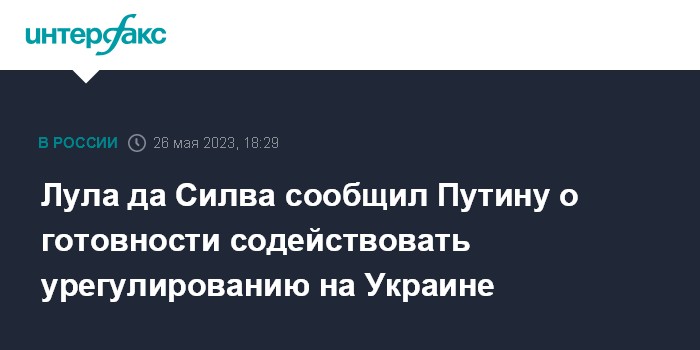 Москва. 26 мая. INTERFAX.RU - Президент Бразилии Луис Инасиу Лула да Силва сообщил, что поговорил по телефону с российским лидером Владимиром Путиным и заверил его в готовности помогать с мирным урегулированием конфликта на Украине, сообщает Globo.