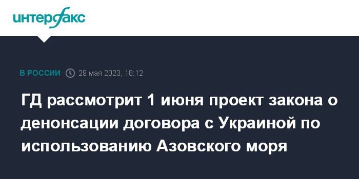 Москва. 29 мая. INTERFAX.RU - Госдума планирует 1 июня рассмотреть проект закона о денонсации договора с Украиной по использованию Азовского моря и Керченского пролива, сообщил "Интерфаксу" источник в палате парламента РФ.