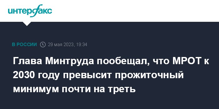 Москва. 29 мая. INTERFAX.RU - Минимальный размер оплаты труда (МРОТ) превысит прожиточный минимум на 30% к 2030 году, сообщил министр труда и социальной защиты РФ Антон Котяков.