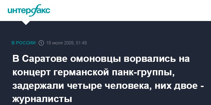 Саратов. 16 июля. ИНТЕРФАКС-ПОВОЛЖЬЕ - Во Фрунзенском районе Саратова в среду вечером в клубе "Каньон" из-за звонка местного жителя сотрудники милиции прервали концерт панк-группы Tower Blocks (Германия); избиты двое журналистов местных изданий, еще двое зрителей задержаны.