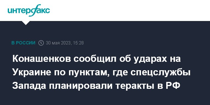 Москва. 30 мая. INTERFAX.RU - Российские военные нанесли авиаудары по центральным украинским пунктам принятия решений, где планировались атаки на территории России, заявил официальный представитель Минобороны РФ Игорь Конашенков.