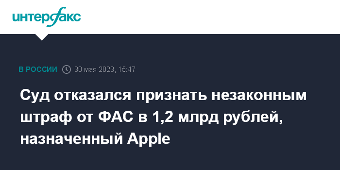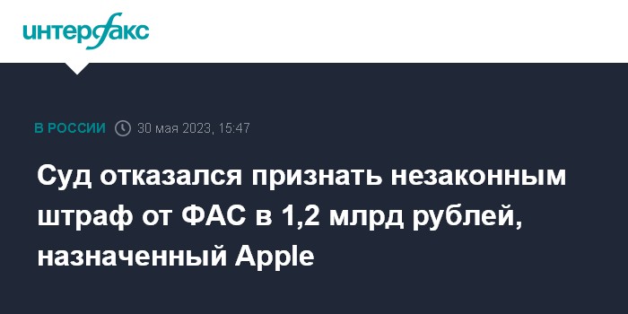Москва. 30 мая. INTERFAX.RU - Арбитражный суд Москвы отклонил иск компании Apple о признании недействительными и отмене решения и предписания Федеральной антимонопольной службы России от 29 июля 2022 года о привлечении к административной ответственности, а также постановления службы от 17 января 2023 года о 1,2 млрд рублей штрафа.