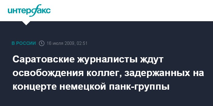 Саратов. 16 июля. ИНТЕРФАКС-ПОВОЛЖЬЕ - Задержанные в Саратове на концерте немецкой группы Tower Blocks два журналиста до сих пор не отпущены из Фрунзенского РУВД города, сообщил агентству "Интерфакс-Поволжье" корреспондент местного издания "Газета наша версия", находящийся у здания РУВД.