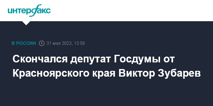 Москва. 31 мая. INTERFAX.RU - Депутат Государственной Думы от Красноярского края Виктор Зубарев скончался на 63-м году жизни, сообщил депутат Заксобрания региона Илья Зайцев в своем телеграм-канале.