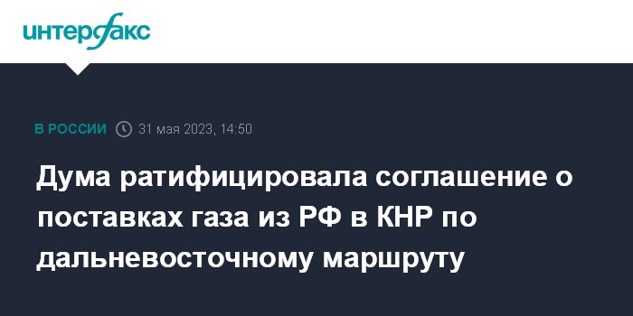 Москва. 31 мая. INTERFAX.RU - Госдума на заседании в среду ратифицировала соглашение между правительствами РФ и КНР о сотрудничестве в сфере поставок природного газа из России в Китай по дальневосточному маршруту.