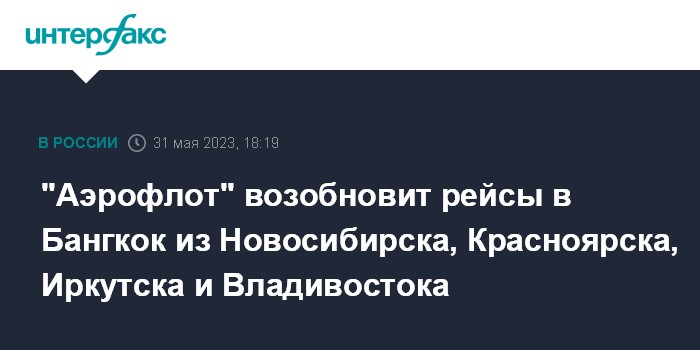 Москва. 31 мая. INTERFAX.RU - "Аэрофлот" в июле возобновляет прямые регулярные рейсы в Бангкок из Новосибирска, Красноярска, Иркутска и Владивостока, сообщила компания.