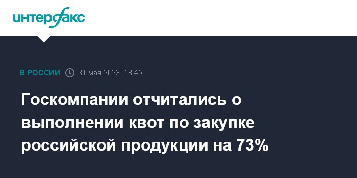 Москва. 31 мая. INTERFAX.RU - Госкомпании, согласно их отчетам, выполнили в 2022 году квоты по закупке российской продукции (учитывается также продукция стран ЕАЭС) на 73%, заявил на конференции замначальника отдела департамента стратегического развития и корпоративной политики Минпромторга Алан Фаизов.