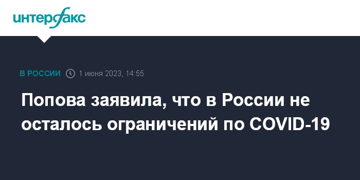 Москва. 1 июня. INTERFAX.RU - В России отменены практически все ограничения, введенные из-за пандемии коронавируса, ограничений в прямом смысле не осталось, заявила глава Роспотребнадзора Анна Попова.