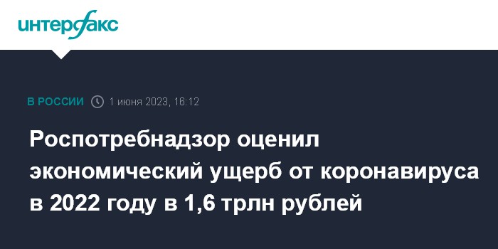Москва. 1 июня. INTERFAX.RU - Экономический ущерб Российской Федерации от коронавирусной инфекции в 2022 году составил порядка 1,6 триллионов рублей. Об этом говорится в докладе Роспотребнадзора, опубликованном на сайте ведомства в четверг.