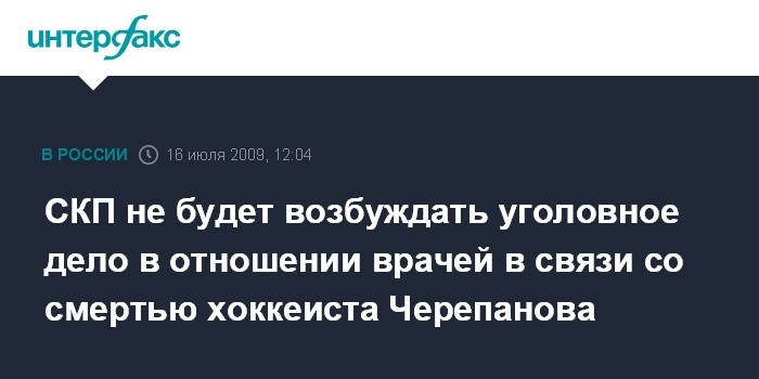 Москва. 16 июля. INTERFAX.RU - Органами следственного комитета при прокуратуре РФ по Омской области принято решение отказать в возбуждении уголовного дела в отношении врачей в связи с фактом смерти в октябре 2008 года хоккеиста Алексея Черепанова, сообщил официальный представитель СКП РФ Владимир Маркин.