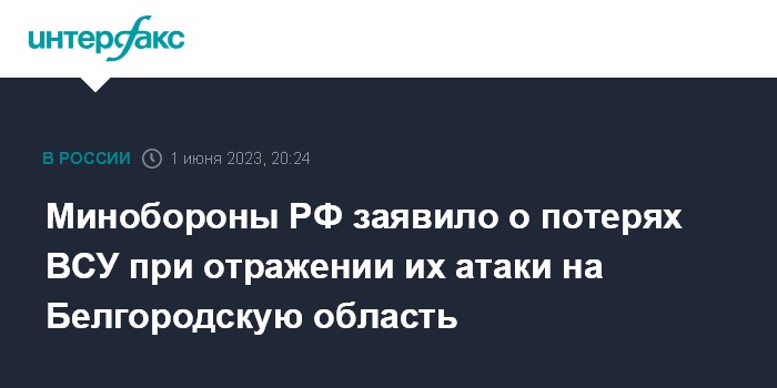 Москва. 1 июня. INTERFAX.RU - Минобороны РФ сообщило, что украинская сторона потеряла более 50 человек в попытках прорвать госграницу в Белгородской области.