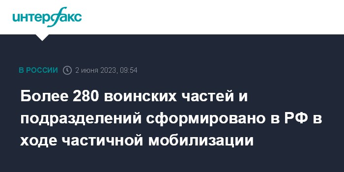 Москва. 2 июня. INTERFAX.RU - С начала проведения частичной мобилизации в российской армии сформировано свыше 280 воинских частей и подразделений, сообщил заместитель начальника Генерального штаба Вооружённых сил РФ Евгений Бурдинский.