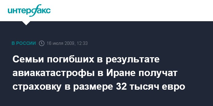 Москва. 16 июля. INTERFAX.RU - Семьи погибших пассажиров в результате авиакатастрофы в Иране самолета Ту-154 иранской компании Caspian Airlines получат страховую выплату в размере 32 тыс. евро на каждого погибшего, сообщил начальник Главного управления гражданской авиации Армении Артем Мовсесян в четверг на заседании правительства. По его словам, в настоящее время ведутся переговоры со страховой компанией. Названия компании он не уточнил.