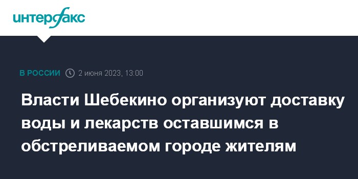 Москва. 2 июня. INTERFAX.RU - Для оставшихся в городе Шебекино жителей будет организован подвоз воды и медикаментов, сообщил глава администрации Шебекинского городского округа Белгородской области Владимир Жданов.