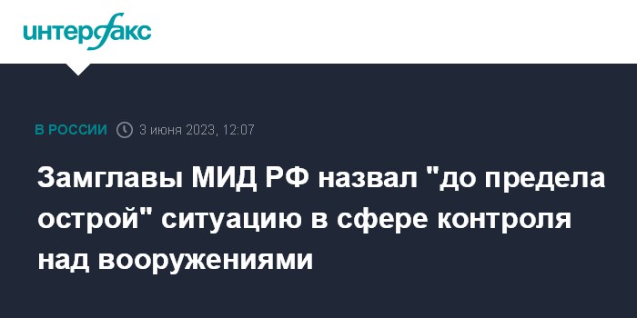 Москва. 3 июня. INTERFAX.RU - Ситуация в сфере контроля над вооружениями предельно острая, заявил в субботу замглавы МИД РФ Сергей Рябков.