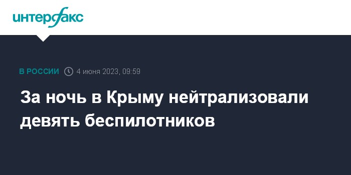 Москва. 4 июня. INTERFAX.RU - Российские военные нейтрализовали в Крыму девять беспилотников за ночь, сообщил глава республики Сергей Аксенов.