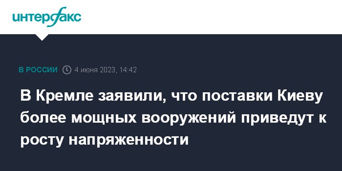 Москва. 4 июня. INTERFAX.RU - В Кремле отмечают, что мощность вооружений, поставляемых Западом на Украину, неуклонно растет, что неизбежно приведет к росту напряженности и заставит Россию быть более собранной и мобилизованной.