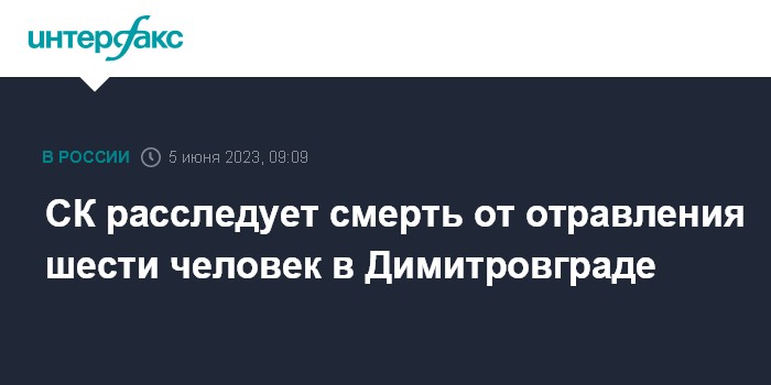 Москва. 5 июня. INTERFAX.RU - В Димитровграде шесть человек умерли в больнице, куда их доставили с отравлением, по факту возбуждено уголовное дело по статье об оказании услуг, не отвечающих требованиям безопасности, повлекшем гибель людей (ч. 3 ст. 238 УК), сообщило управление Следственного комитета по Ульяновской области.