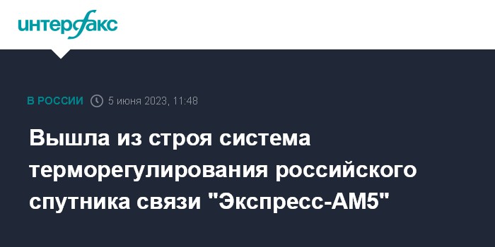 Москва. 5 июня. INTERFAX.RU - Специалисты ограничили работу российского спутника связи "Экспресс-АМ5" из-за отказа системы терморегулирования космического аппарата, сообщили в государственном операторе спутниковой связи ФГУП "Космическая связь" (ГП КС).