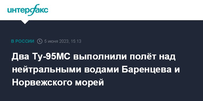 Москва. 5 июня. INTERFAX.RU - Пара стратегических бомбардировщиков Ту-95МС выполнили плановый полёт в воздушном пространстве над нейтральными водами акваторий Баренцева и Норвежского морей, сообщило Министерство обороны РФ в понедельник.