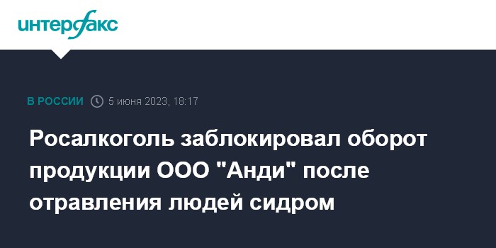 Москва. 5 июня. INTERFAX.RU - Росалкогольрегулирование заблокировало оборот продукции ООО "Анди" (Самарская область), выпускающего напиток "Мистер сидр".
