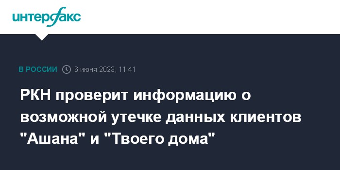 Москва. 6 июня. INTERFAX.RU - Роскомнадзор проверит информацию об утечке данных клиентов торговых сетей "Ашан" и "Твой дом", сообщили "Интерфаксу" в ведомстве.