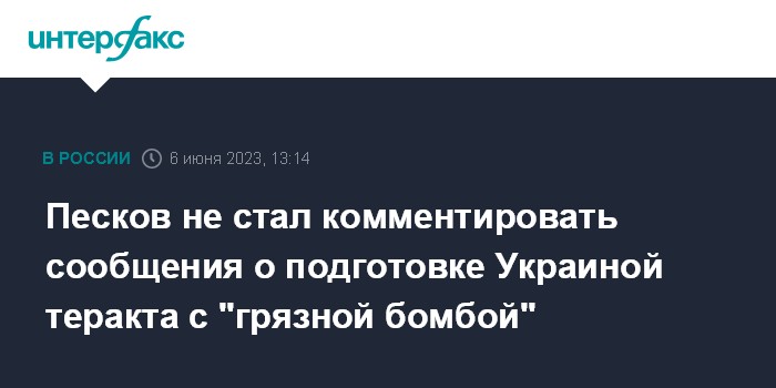 Москва. 6 июня. INTERFAX.RU - В Кремле не комментируют сообщение ФСБ РФ о подготовке Главным управлением разведки министерства обороны Украины теракта с использованием так называемой грязной бомбы на территории России.