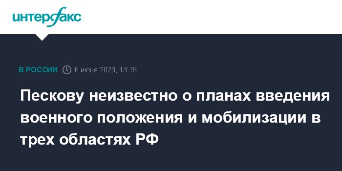 Москва. 6 июня. INTERFAX.RU - Пресс-секретарь президента РФ Дмитрий Песков заявил, что ему неизвестно о планах введения военного положения и мобилизации в Белгородской, Брянской и Курской областях РФ.