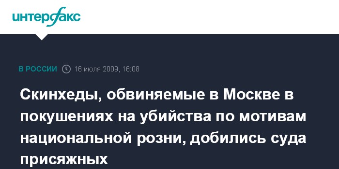 Москва. 16 июля. INTERFAX.RU - Мосгорсуд будет рассматривать уголовное дело в отношении группы молодых людей, обвиняемых в совершении ряда покушений на убийства по мотивам национальной ненависти, с участием коллегии присяжных, сообщила "Интерфаксу" руководитель пресс-службы Мосгорсуда Анна Усачева.