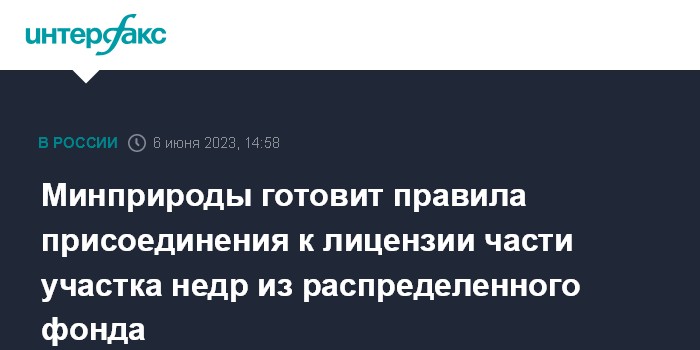 Москва. 6 июня. INTERFAX.RU - Минприроды предлагает механизм присоединения к лицензии части участка недр, находящегося в распределенном фонде. Проект постановления правительства "Об утверждении Правил установления и изменения границ участков недр, предоставленных в пользование" опубликован на сайте regulation.gov.ru.
