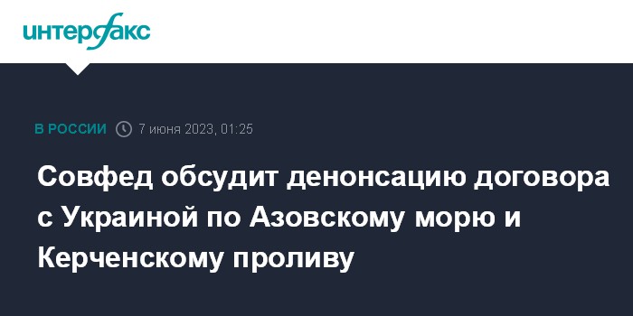 Москва. 7 июня. INTERFAX.RU - Совет Федерации на заседании в среду рассмотрит закон о денонсации договора между Россией и Украиной о сотрудничестве в использовании Азовского моря и Керченского пролива.