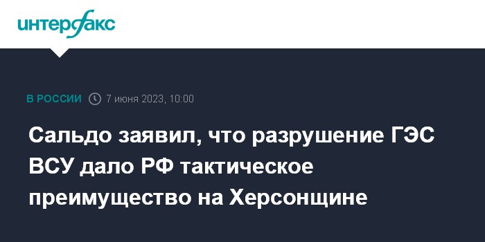 Москва. 7 июня. INTERFAX.RU - Разрушение украинским обстрелом инфраструктуры Каховской ГЭС в Херсонской области дало военно-тактическое преимущество Вооруженным силам России, заявил врио губернатора региона Владимир Сальдо.