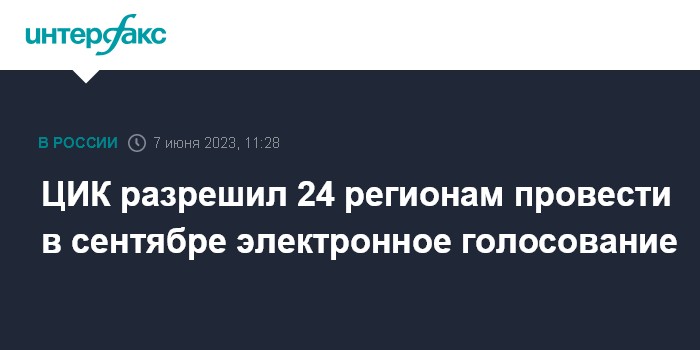 Москва. 7 июня. INTERFAX.RU - В сентябре 2023 года 24 региона примут участие в дистанционном электронном голосовании на выборах различного уровня, решили члены Центризбиркома на заседании 7 июня.
