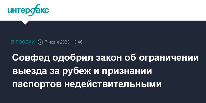 Москва. 7 июня. INTERFAX.RU - Совет Федерации на заседании в среду проголосовал за закон, уточняющий нормы о признании паспортов россиян недействительными, а также об ограничениях на выезд для некоторых категорий граждан.