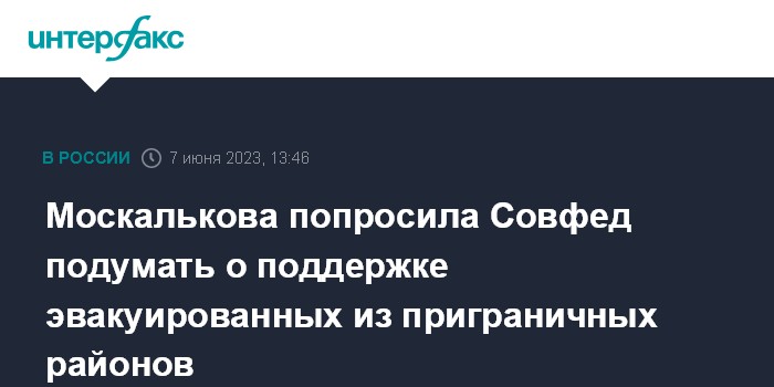 Москва. 7 июня. INTERFAX.RU - Следует определить правовой статус и возможные меры поддержки россиян, эвакуированных из Белгородской области и других районов, граничащих с Украиной, заявила в среду уполномоченная по правам человека в РФ Татьяна Москалькова, выступая в Совете Федерации.