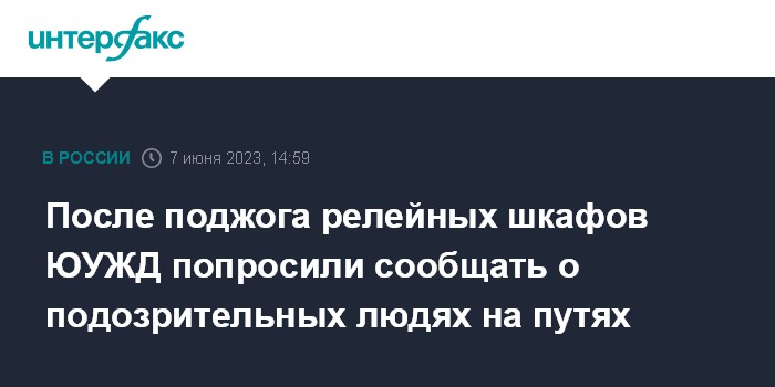 Москва. 7 июня. INTERFAX.RU - Возгорание релейных шкафов произошло 6 июня на перегоне Сыростан-Хребет Южно-Уральской железной дороги, сообщили в среду "Интерфаксу" в пресс-службе ЮУЖД и призвали граждан сообщать о любых подозрительных действия, которые они заметят на железной дороге.