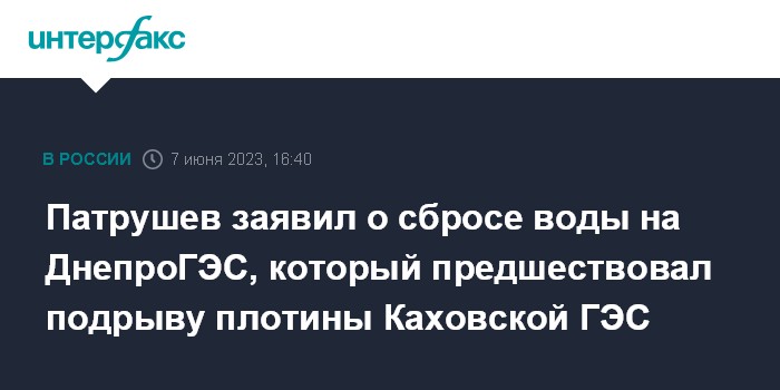Москва. 7 июня. INTERFAX.RU - Подрыв Каховской ГЭС совершен украинской стороной, удару предшествовал масштабный сброс воды на ДнепроГЭС, заявил секретарь Совбеза РФ Николай Патрушев.