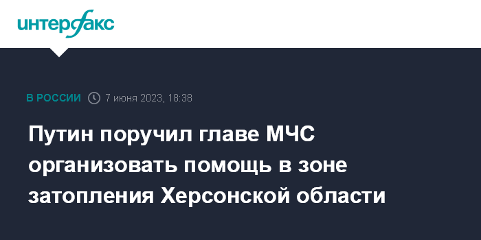 "Путин поручил главе МЧС организовать в Херсонской области в зоне затопления, вызванного диверсией киевского режима на Каховской ГЭС, работу по помощи людям и ликвидации последствий этого бедствия", - сказал Песков.