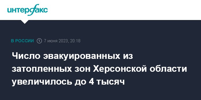 Москва. 7 июня. INTERFAX.RU - Более 4 тысяч жителей прибрежных населенных пунктов Херсонской области эвакуированы с территорий, подтопленных в результате разрушения инфраструктуры Каховской ГЭС. Об этом сообщил врио губернатора Владимир Сальдо.