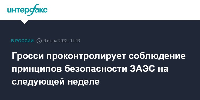 Гросси лично возглавит миссию по ротации инспекторов МАГАТЭ на ЗАЭС из-за ситуации с Каховской ГЭСЧитать подробнее"Гросси посетит ЗАЭС на следующей неделе, чтобы оценить ситуацию после разрушения плотины Каховской ГЭС и проконтролировать соблюдение пяти основных принципов защиты АЭС, которые он представил Совету Безопасности ООН 30 мая", - говорится в сообщении.