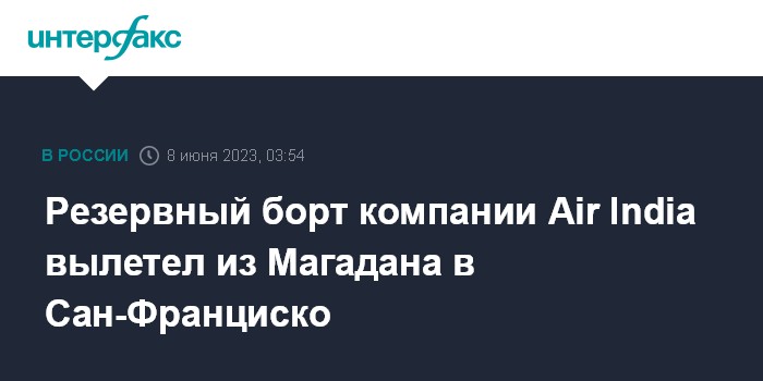 "Резервный самолет компании Air India с пассажирами вылетел в 10:27 по магаданскому времени (02:27 мск - ИФ)", - сказал собеседник агентства.