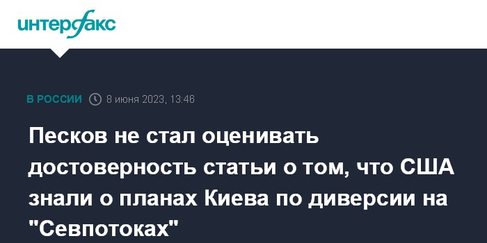 Москва. 8 июня. INTERFAX.RU - Пресс-секретарь президента РФ Дмитрий Песков отказался оценивать, насколько соответствуют действительности публикации о том, что Вашингтон заранее знал о планах Киева устроить диверсию на "Северных потоках", заявив, что в Кремле продолжают настаивать на расследовании взрывов.
