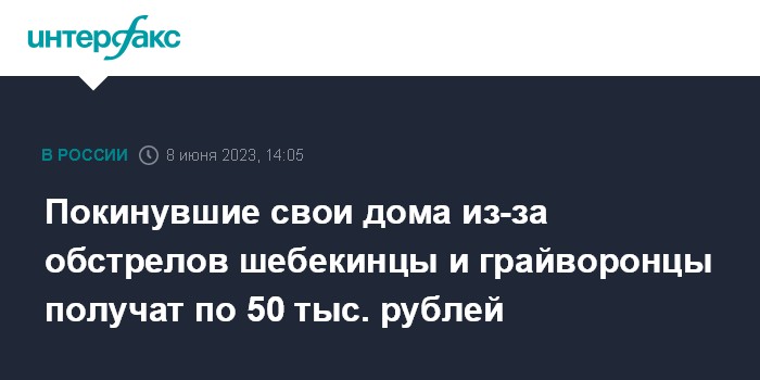 Ранее в понедельник он сообщил о выплате 10 тыс. рублей, которую жители Шебекинского и Грайворонского округов, покинувшие свои дома, начнут получать с 9 июня.