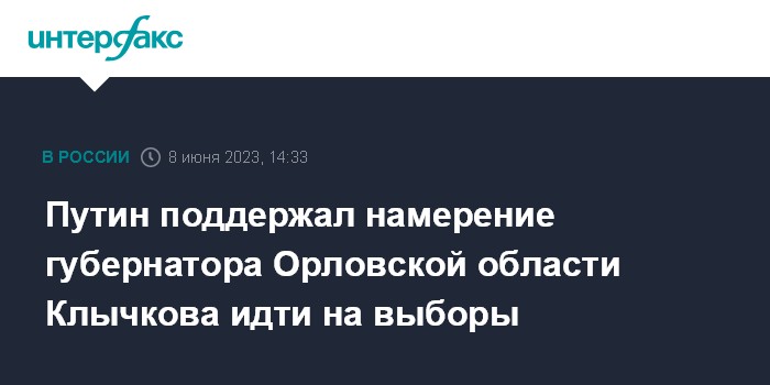 Москва. 8 июня. INTERFAX.RU - Президент РФ Владимир Путин поддержал намерение губернатора Орловской области Андрея Клычкова идти на выборы главы региона.