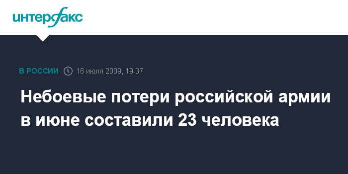 Согласно данным Минобороны РФ, опубликованным на официальном сайте в четверг, в июне 2009 г. в вооруженных силах РФ зафиксировано 14 самоубийств, шесть несчастных случаев, два случая нарушений правил обращения с оружием, один случай гибели в результате нарушение правил дорожного движения и эксплуатации транспортных средств.