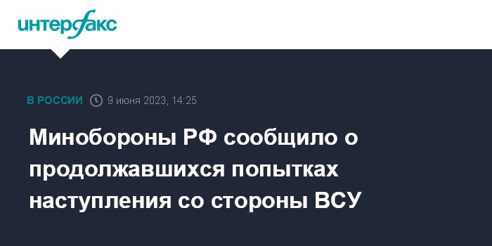 Москва. 9 июня. INTERFAX.RU - Вооружённые силы Украины в течение минувших суток вели попытки наступательных действий на южно-донецком и запорожском направлениях, сообщил официальный представитель Министерства обороны РФ Игорь Конашенков на брифинге в пятницу.