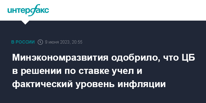 Москва. 9 июня. INTERFAX.RU - В Минэкономразвития считают правильным, что Банк России при принятии решения по ключевой ставке учел не только возможные инфляционные риски, но и фактический уровень инфляции, заявил журналистам в кулуарах Евразийского конгресса министр экономического развития Максим Решетников .