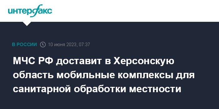 Москва. 10 июня. INTERFAX.RU - МЧС РФ направило в Херсонскую область мобильное оборудование для санитарной обработки местности, чтобы избежать вспышек инфекций, сообщила пресс-служба министерства в субботу.